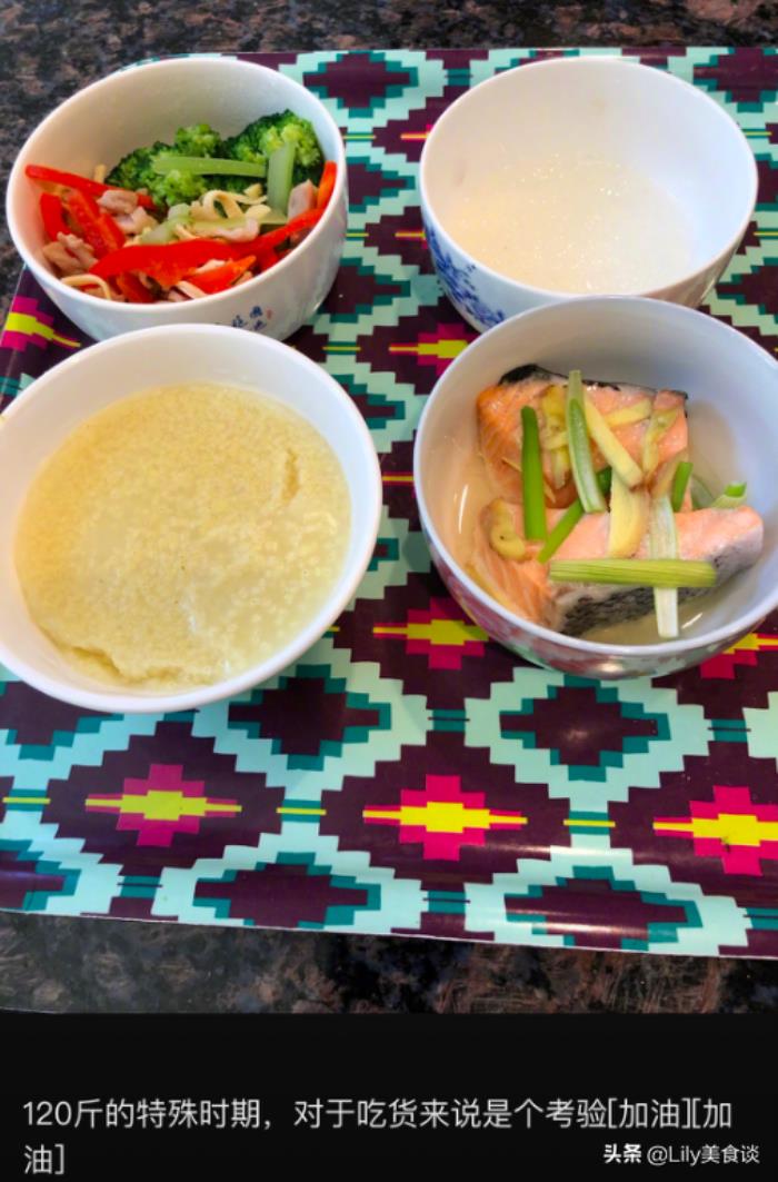 每一餐除了按时好好吃饭之外,用餐的搭配营养也很重要,三文鱼补充蛋白质、小米粥粗粮淀粉、另外一些杂蔬的搭配补充维生素等等,这样一餐搭配下来还是非常营养健康的。在120斤的特殊时期,对于吃货的饮食也是个考验,合理的饮食和营养的搭配,这样瘦下来才更健康哦。蛋白质食物鸡蛋、牛肉、鸡胸肉、三文鱼肉都是非常不错的选择。粗粮面包、粗粮粥、凉拌蔬菜等等。