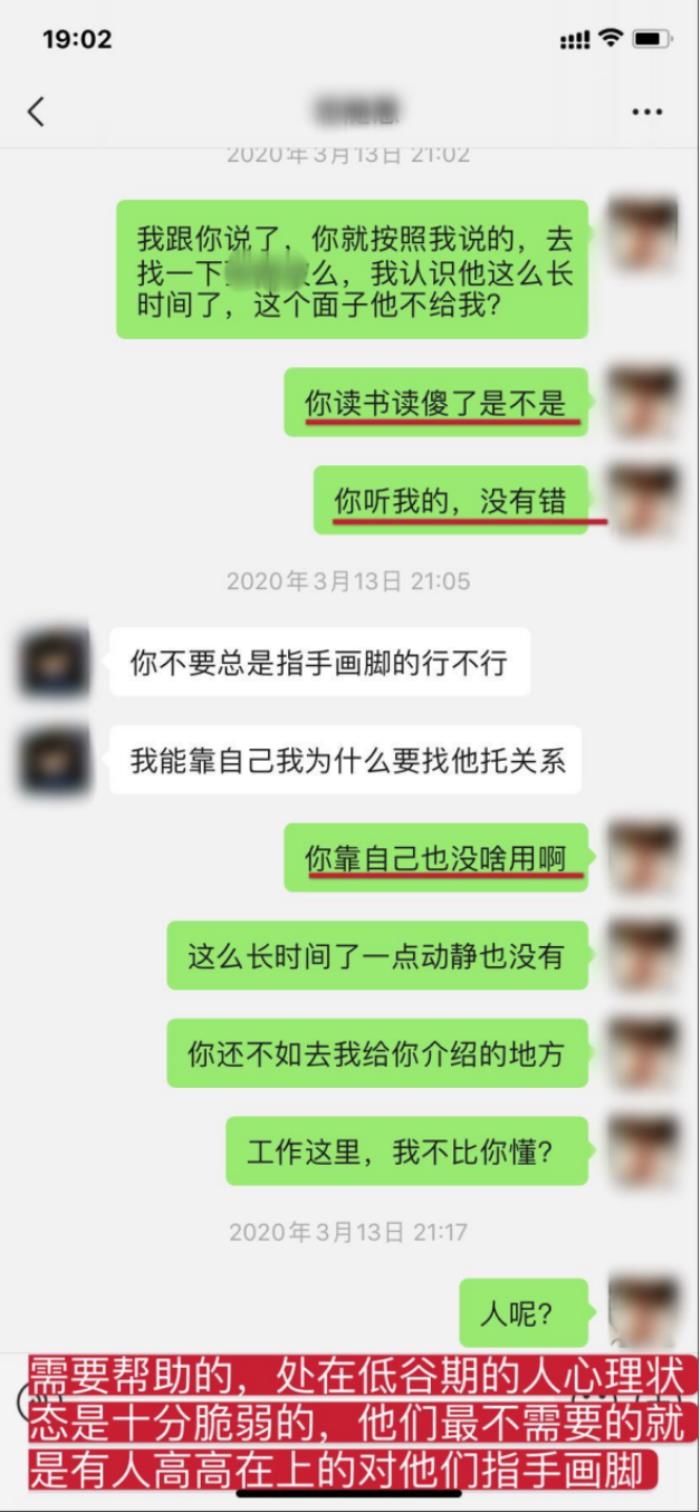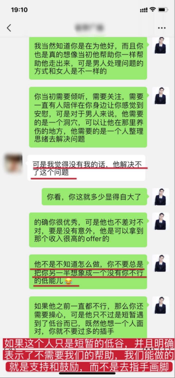 在这次聊天对话中,妻子总是采取高高在上的态度,不管是正常聊天还是想挽回对方:我来引导你,我说的对,你要听我的。而这种态度是恢复中的最后一件事。