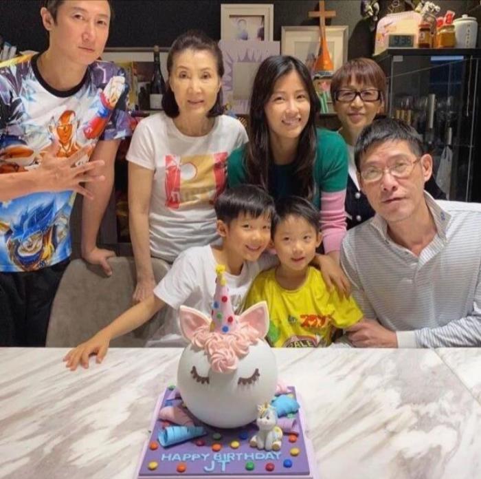 近日,洪金宝前妻曹恩玉为儿媳周家蔚庆祝37岁生日,照片中的曹恩玉身穿白色家居服,头发往后梳露出额头,和长子一家人聚在一起。