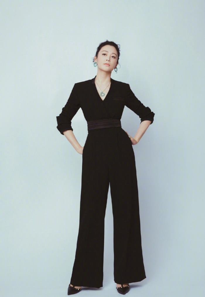 作为制片人,陈红也选择了一身MaxMara干练的暗色系裤装造型,连体裤设计既保持了西装的干练气场,同时也突出了独立的身份地位,摆脱套装的呆板印象,增加了都市感,十分摩登。整体立体剪裁特别贴身,线条干净流畅,陈红略显丰腴的身材恰好衬托出了高贵气质,宽裤管则强调了整体气场优势。
