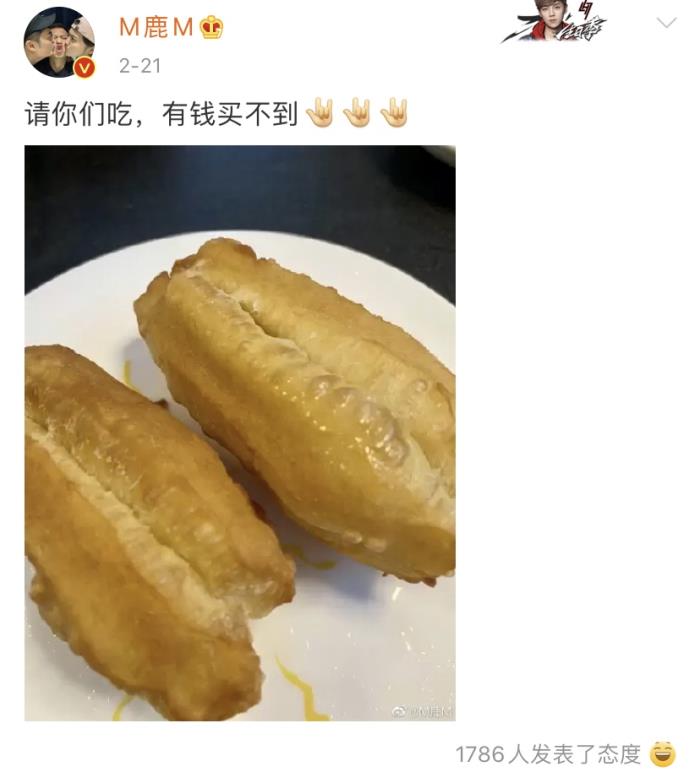 上周,鹿晗在微博上晒出自制油条还配图称"有钱也买不到"。