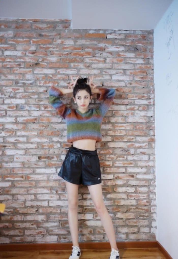 不得不说,在夏天扎丸子头绝对是清爽利落的一个选择了,像古力娜扎这样一件简单的彩虹粉色短款毛衣搭配皮裤,中间小蛮腰展现的一览无余,一双大长腿,又细又长,又直又白。双手比耶的姿势也太甜美可爱了吧,还是那个俏皮可爱活泼,青春靓丽的少女!