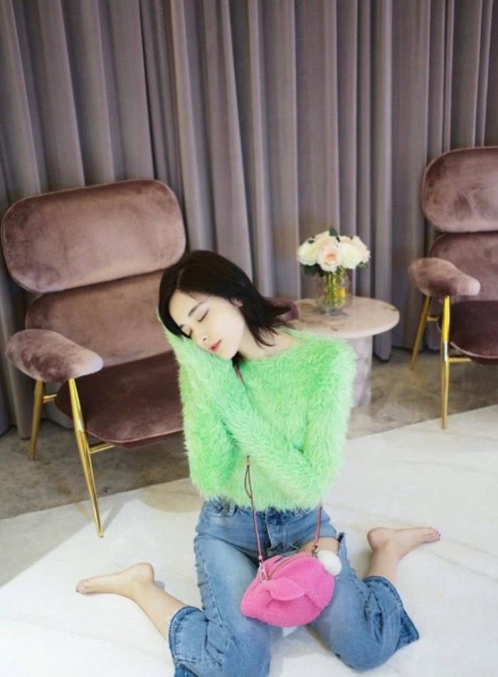 当然青春靓丽就是需要一些颜色的碰撞,像这样一件亮绿色的毛衣在娜扎的演绎下把皮肤显得更加白皙光滑透亮,搭配一条简单的浅色系牛仔裤,大腿那里还有一点点的破洞的设计,时髦复古又青春靓丽,搭配一个粉色的小兔子形状包包也太甜美可爱了吧,童真感趣味感设计感十足,别看着是一身简单的颜色碰撞搭配,然而却有小巧思,非常的吸引人,而且拍照的姿势不仅限于像往常普通的那样,也可以学娜扎这样子的,拍照姿势也是非常的好看时髦~