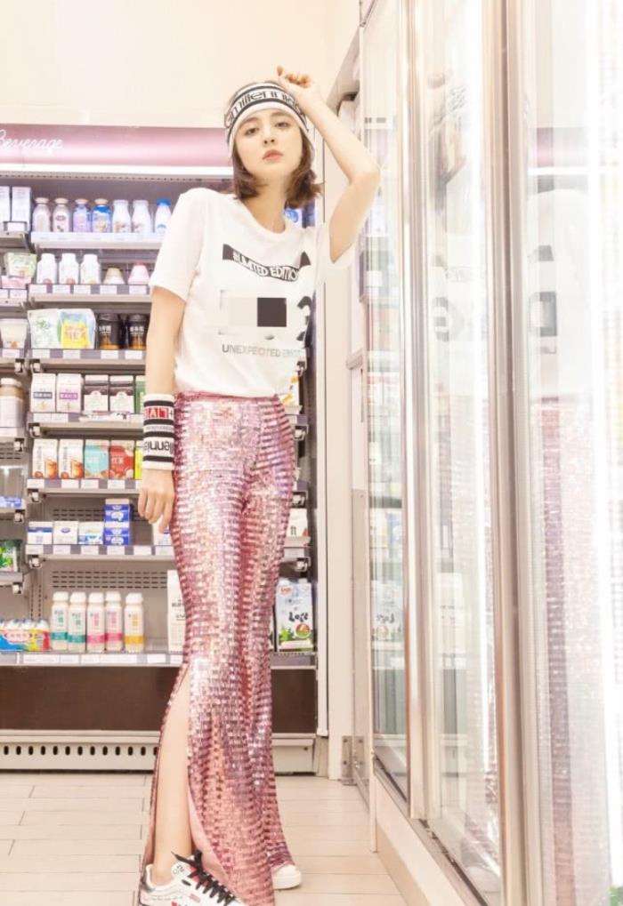 这身搭配乍一看普通人完全驾驭不了,一件亮粉色的亮片开叉喇叭裤,普通人看上完全是望而却步的,然而在娜扎的演绎下却也毫无违和感,上面搭配白色的简单T恤下面这件特别有亮点的,亮粉色开叉亮片裤搭配运动白鞋倒也是非常的好看时髦呢。再准备一点运动元素的单品,比如说像这个白色的运动发带加手腕腕带,也是非常的好看的,时髦和运动等结合起来。复古青春靓丽!