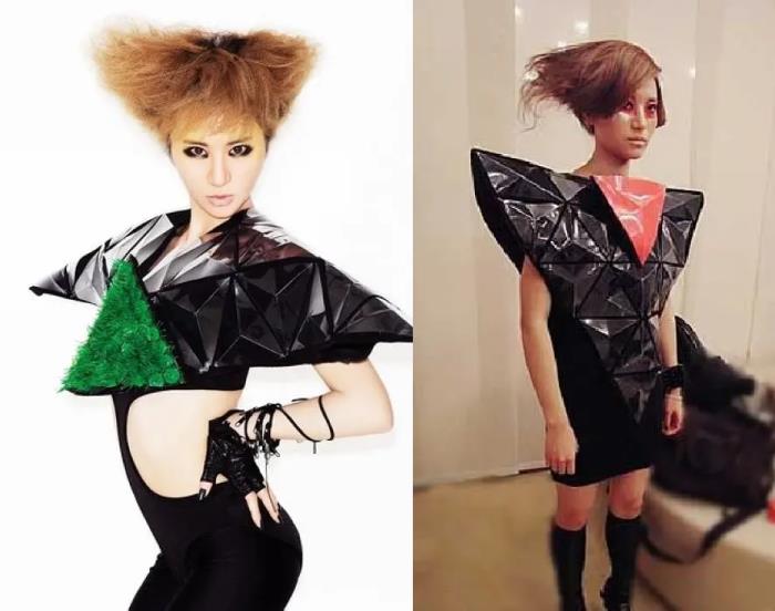尚雯婕的造型,衣服上还会有非常奇怪的图案,比如一大块绿色的三角形,或者一大块粉红色的三角形,看起来像AI机器人一样。