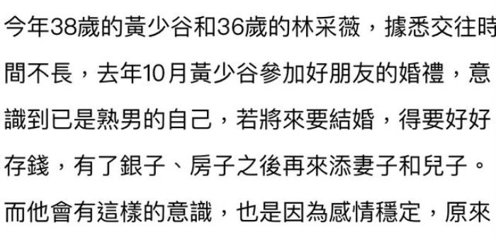 据悉,两人交往的时间并没有多久,此前,在某个好友婚礼上黄少谷称自己有想结婚的想法,还说自己会努力存钱,这样才能买到房子然后再结婚。