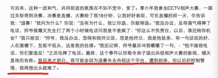 2006年,参加了CCTV相声大赛且进入了决赛的曹云金突然宣布退赛,实在是让人费解,曹云金在长文中说是郭德纲强迫他退赛了,而且不给理由,最终不仅惹得师爷侯耀文气急摔电话,还有可能遭到“封杀”。