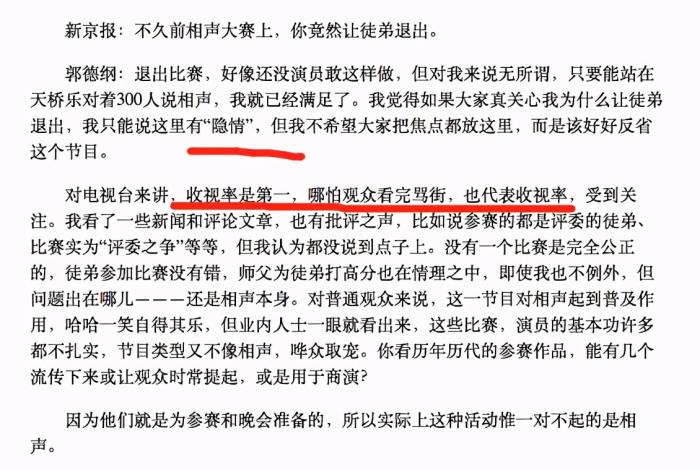 而当年关于曹云金退赛,郭德纲是这样说的:这里面有隐情,电视台想要的是收视率,收视率上来了,但是这些相声演员包括他们的相声有几个能成为经典作品?如果我们参加了,就会有舆论说郭德纲被招安了,草根不再代表草根。