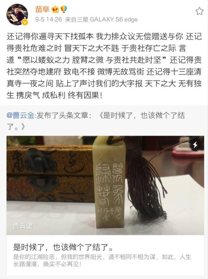 曹云金于数日后也发布了那篇近7000字的长文一一细数多年来的大小事件,进行反击。而支持他的西安的相声演员苗阜等人。但在发布不久之后,苗阜便把这条微博删除了,只留下一句“听人劝 吃饱饭! ”。