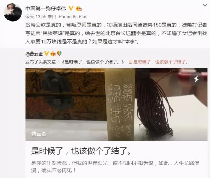 而在曹云金发布长文后,“中国第一狗仔卓伟”也转发并写道,“贪 污公 款是真的,背叛恩师是真的,每场演出给同道徒弟150是真的,徒弟打记者夸徒弟‘民族英雄’是真的,给去世的台长送囍字是真的,不知睡 了女记者倒找人家要10万块钱是不是真的?如果是这才叫‘本事’。”