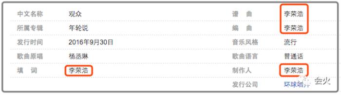 还有,俩人谈恋爱后,李荣浩给杨丞琳写过歌。比如这首《观众》,作词作曲编曲制作人全是李荣浩。