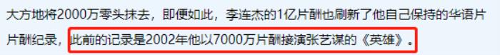 1998年李连杰正式进军好莱坞,成为李小龙、成龙之后第三个走上国际大舞台的中国武打明星,这期间拍摄的电影无一不获得好评,《英雄》的热映更是让他身价翻番,有报道称他当时的的片酬就已经高达7千万人民币了。