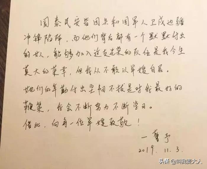 “能够加入这支光荣的队伍,是我今生莫大的荣幸,但我从不敢以军嫂自居。她们的勤奋付出坚韧不拔是对我最好的鞭策,我会不断努力、不断学习,借此,向每一位军嫂致敬。”