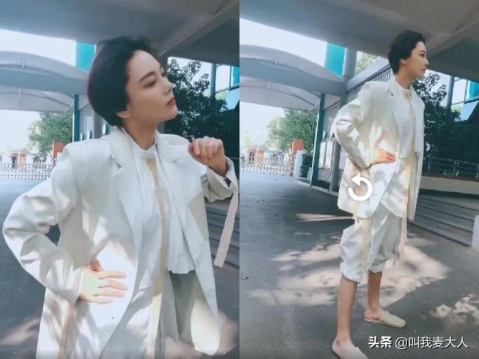 只见她一身白西装英姿飒爽,随意撩动短发更是充满霸气,当镜头往下移时,才看到她脚踩拖鞋,既可爱,又接地气。