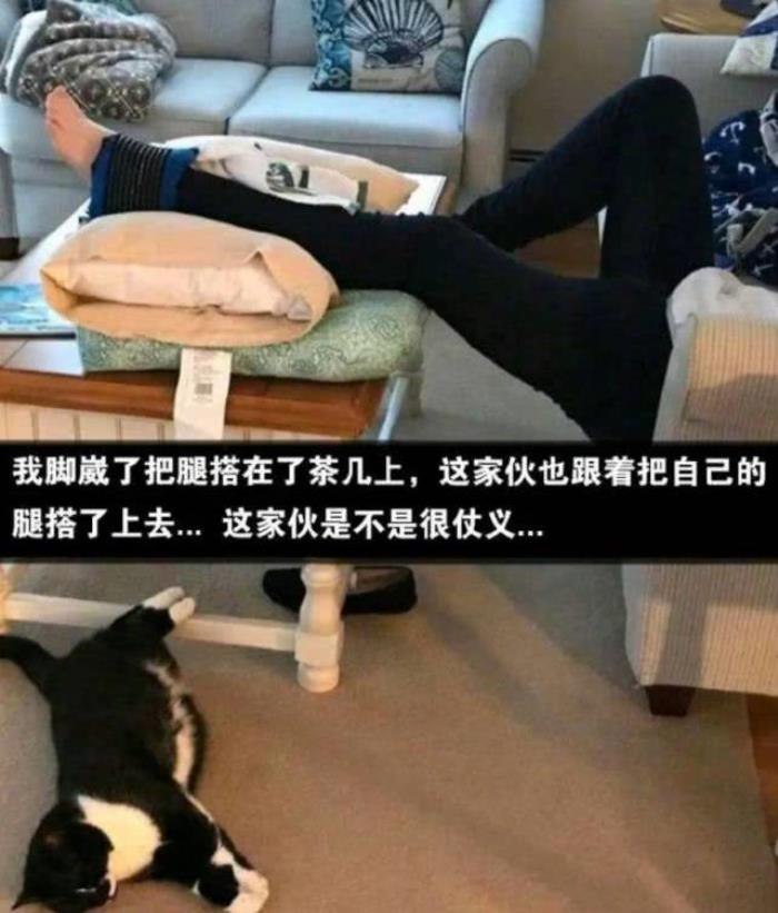 猫咪:今天铲屎官不知道为啥姿势怪怪的,太丢人了。算了,我配合他一下,让他不那么丢人