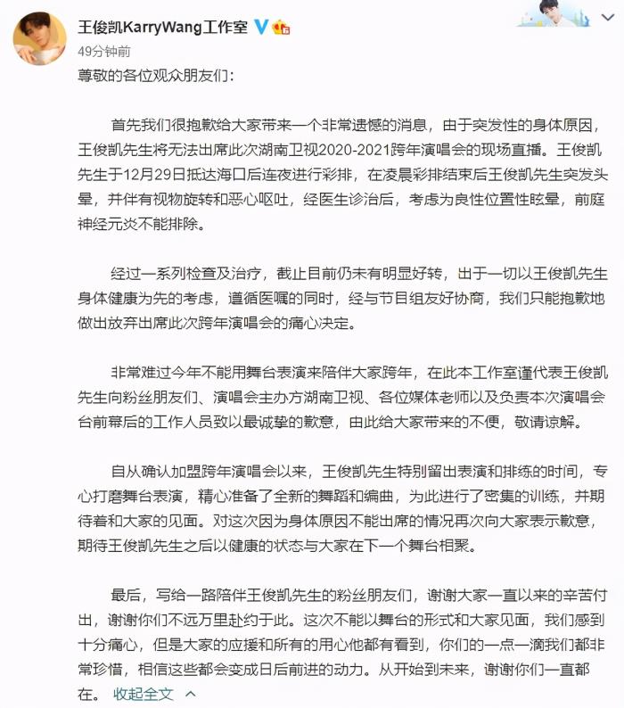 在临近跨年演唱会开播之时,王俊凯工作室突然发布一条微博,称王俊凯由于突发性的身体原因,将会退出湖南卫视的跨年演唱会。据了解,王俊凯正是在海口连夜进行彩排时,突然出现头晕、呕吐等症状,经过一系列治疗却未见明显好转。