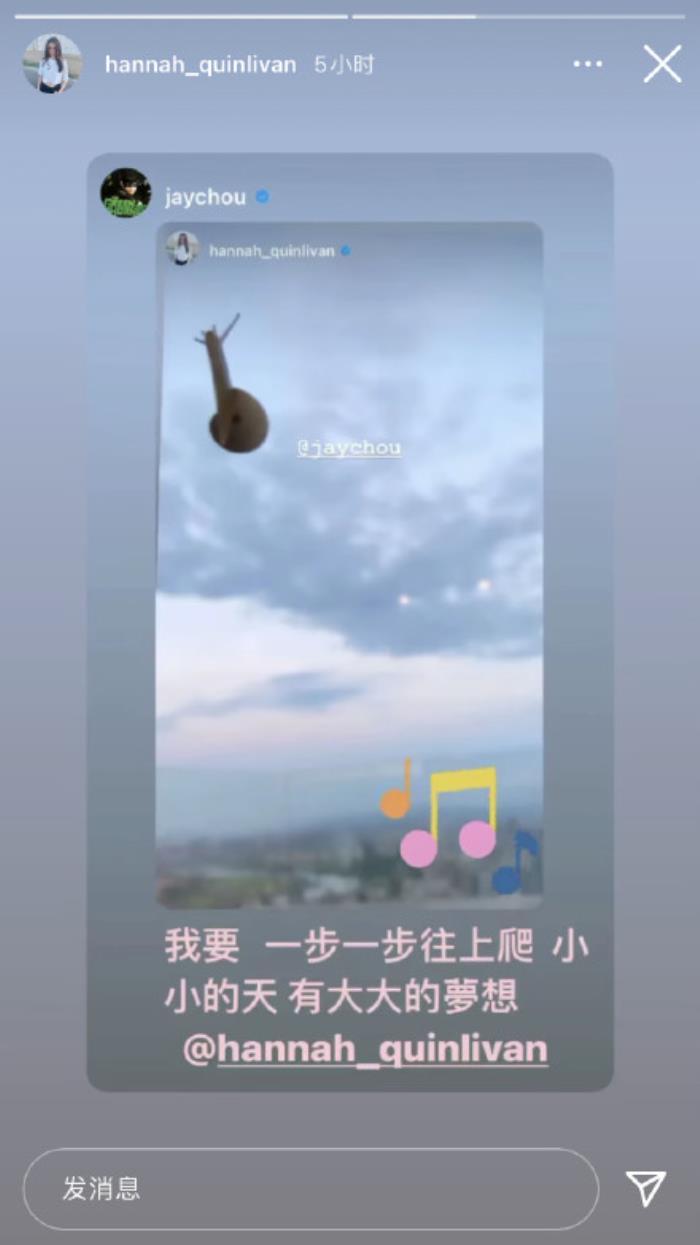5月25日,昆凌在个人社交平台晒出一张蜗牛顺着玻璃窗户往上爬的照片,并配上了周杰伦的《蜗牛》歌词:“我要一步一步往上爬,小小的天,有大大的梦想”。