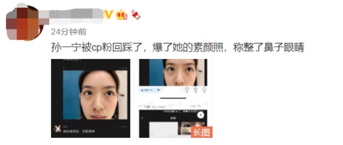 6月22日,有博主发文称:“孙一宁被cp粉回踩了,爆了她的素颜照,称(孙一宁)整了鼻子眼睛”。