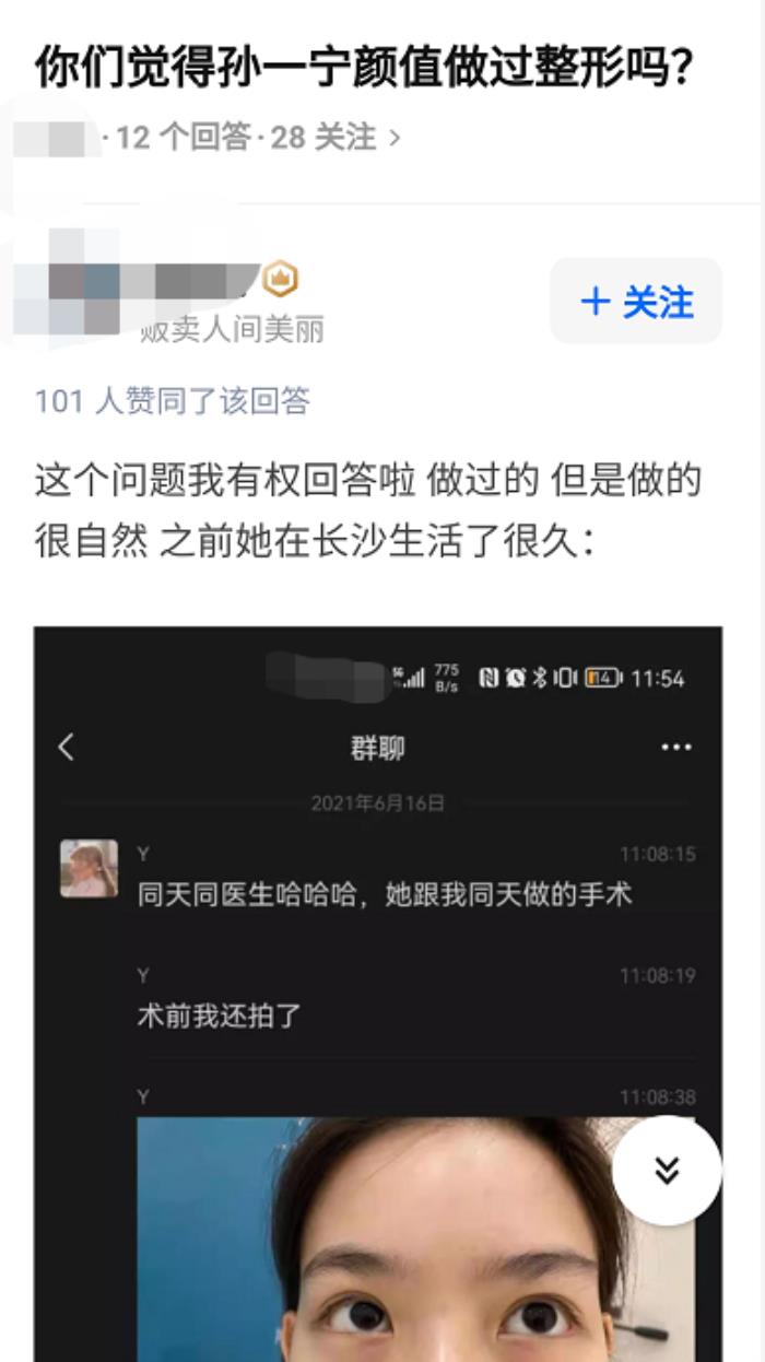 该爆料网友还回复了网友的评论,称孙一宁做了鼻子和眼睛。