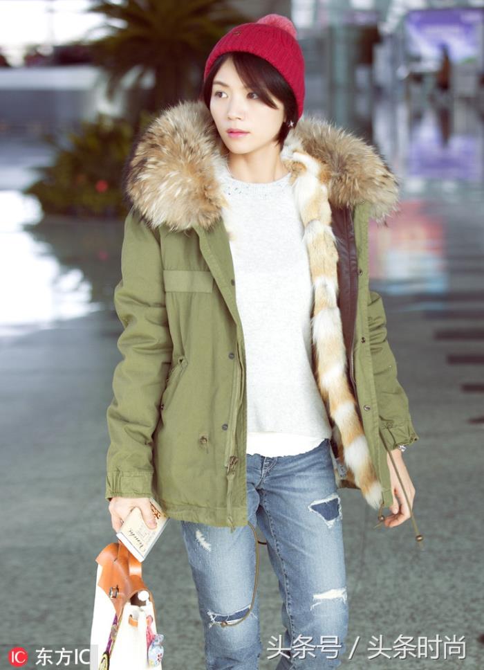 曹曦文军绿色外套搭牛仔裤中性亮眼 红色绒线帽+双肩包简单百搭。