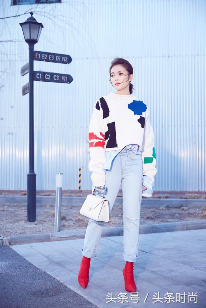 刘涛白色毛衣搭配浅色牛仔裤,脚踩红色贴腿踝靴十分亮眼。