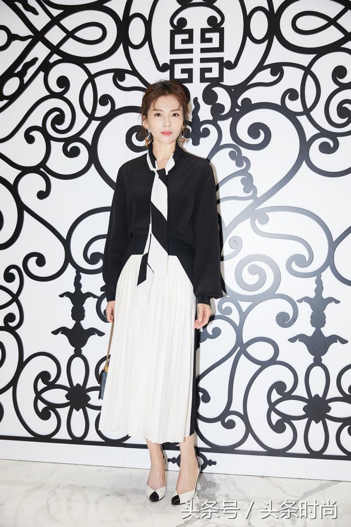 刘涛黑色衬衫搭配百褶裙,领间系着黑白相间的飘带,灵动潇洒中不失优雅。