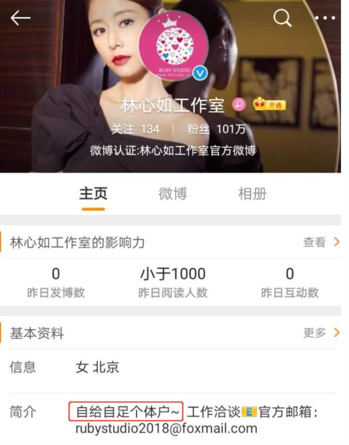 在林心如创办的“林心如工作室”的官方微博上,她用这样的一句话来介绍:“自给自足个体户”。