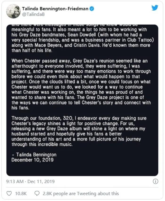 查斯特妻子塔琳达(Talinda)接受推特采访时说:“他走之后大家都很难过,内心备受煎熬。也就没怎么考虑灰色眩晕回归的事。过了一阵情绪算是稳定一些,才开始想:查斯特会希望我们为他做点什么呢?有什么是他自豪的并且想给乐迷做的?”