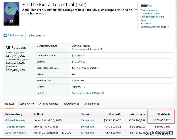 《E.T.外星人》在1982年全球夺得6亿多美元的票房
