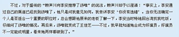 不过,李安是个慎重的人,他并没有立即定下汤唯,而是给朋友赖声川打了个电话,征求对方的意见。