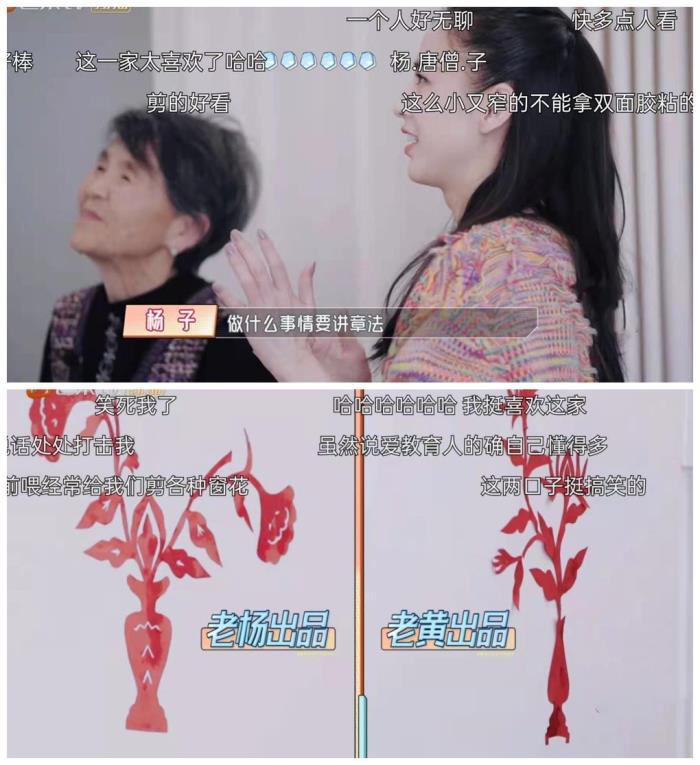 节目中,杨子的妈妈刘丽芹剪了一副剪纸,结果让杨子不小心坐断了。在商量怎么往柜子上贴时,黄圣依觉得米饭好,杨子觉得该用米汤。