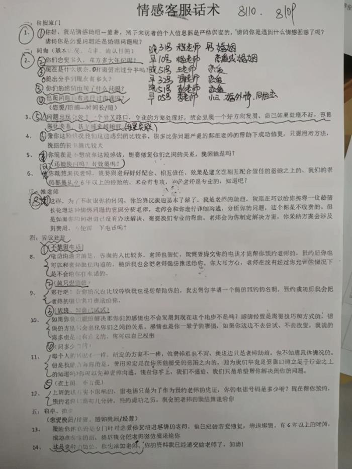 失恋后,男女心理都很脆弱。这家公司有一个特殊的《情感客服话术》。从自我汇报开始,客服人员就会假装关心,成为倾听者,假装与咨询师产生情感共鸣;然后,过渡到推荐“高级分析老师”。