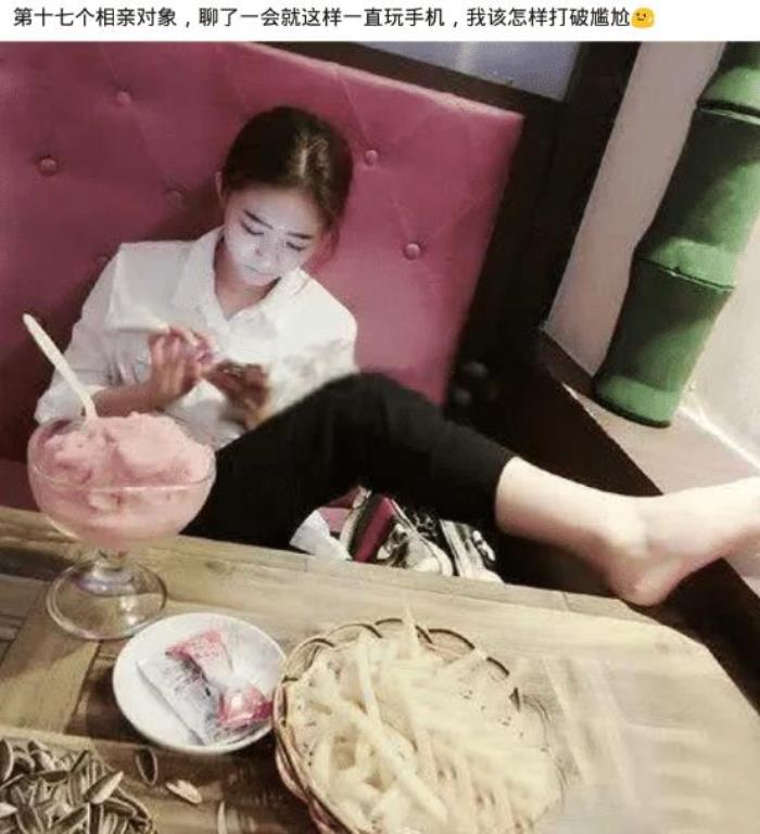 相亲这几年很常见,但是第一次看到这样的相亲。这个相亲女可能在聊天的时候觉得这个小伙子还行,于是放下矜持,开始打开。她脱下鞋子,把脚放在餐桌上,继续玩手机。这个人问如何打破这种尴尬的局面。