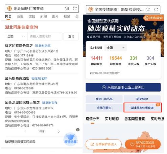 这对于漂泊在外、还无安顿之所的湖北籍旅客来说无疑是一个好消息。只需要在搜狗搜索搜索“湖北同胞住宿”相关关键词就可以快速找到这一功能,并且在搜狗搜索最近上线的“全国疫情实时动态”专题页的显著位置,也能找到访问入口。