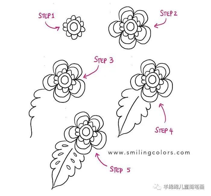 从花芯开始画,然后画出花瓣,接着,在花瓣上面装饰些线条,最后,画出叶子,简单又生动。