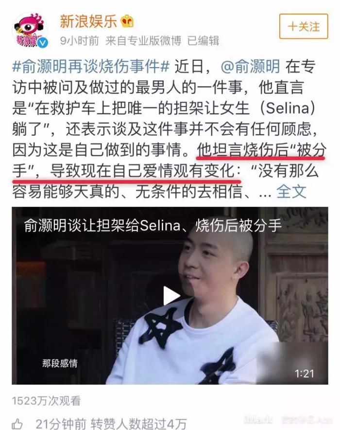 此次热搜的专访中他谈到了自己的爱情观,他坦言烧伤后“被分手”,导致自己爱情观有变化。