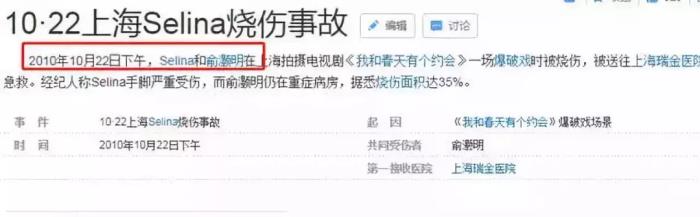 selina和俞灏明在拍摄《我和春天有个约会》一场爆破戏时被烧伤,杨幂在出事后的第二天发微博祈祷,外界都猜测她是为了俞灏明发的祈祷。