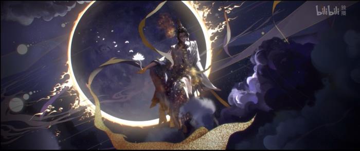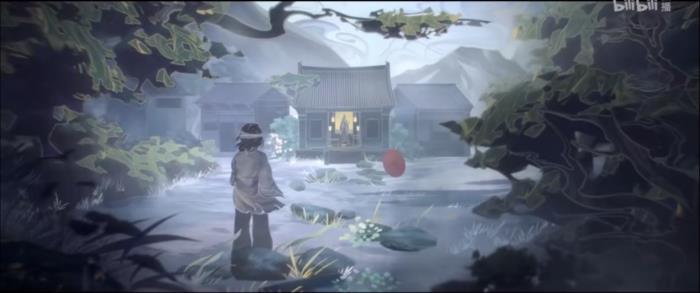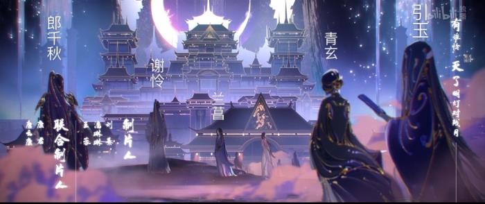 之后的一个有身穿华服的,也有比较朴素的,所以并不是在天上,而且后面的楼看上去也很像千灯观的正面,所以它应该是在鬼市里的千灯观。千灯观的背景是一弯弦月,歌词是"灭了明灯对残月",千灯观实锤了!