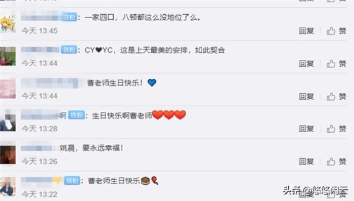 16号姚晨的电影上映,15日,是姚晨的老公曹郁的生日,姚晨工作室分享了一段视频为曹郁庆生。视频中包含了姚晨和曹郁的多张亲密合影,一家四口幸福美满,画面十分温馨。从姚晨经纪人的微博得知,姚晨还为曹郁送上卡片甜蜜告白。看着姚晨和曹郁的亲密合影,甜蜜程度也是羡煞旁人。而且工作室为曹郁庆生的时间也很特别:13:14,寓意自然很多人都明白是“一生一世”。有些有些的粉丝更是解读出俩人能在一起似上天赐予的缘分:姚晨和曹郁俩人名字的首个字母就是CY和YC。于是有粉丝就直言:这是上天最美的安排,如此契合。