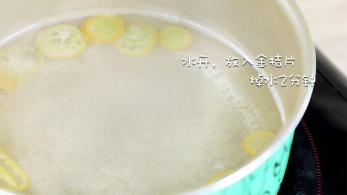 起锅烧水,水开后放入金桔片焯水2分钟。