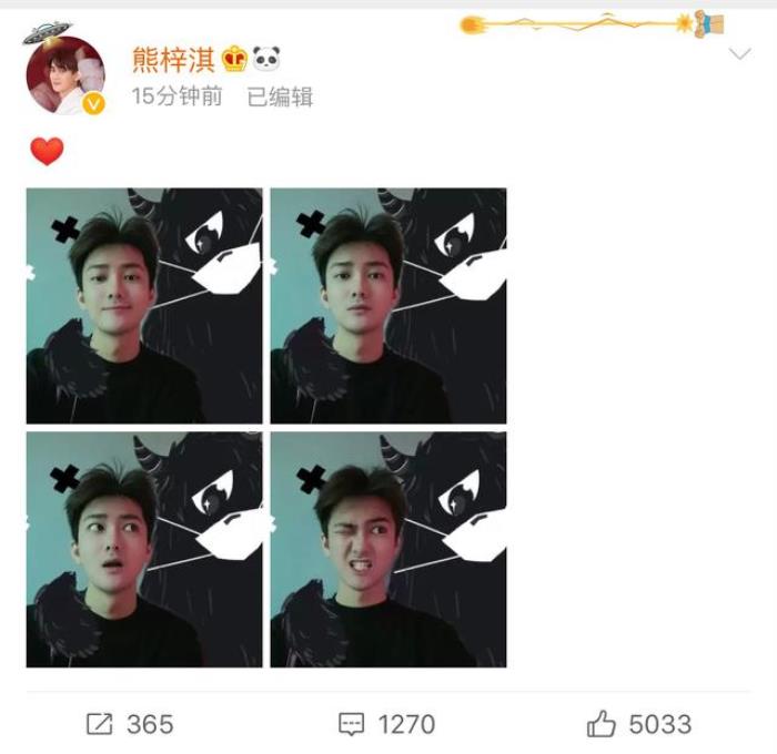 2月14日,熊梓淇与李溪芮再次撒糖,两个人暧昧不清的微博也引起了很多人的关注。今天正值情人节,熊梓淇在社交平台上晒出了4张自拍并配上了爱心的表情,仿佛在隔空示爱。而4张自拍当中,熊梓淇也都给自己画上了如今最火的小怪兽,帅气的颜值配上软萌可爱的小怪兽,画面非常的精美。