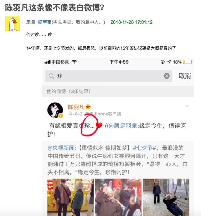知情网友在网上爆料显示该女子可能事与陈羽凡相识多年的何时珍,被网友扒出2014年在微博上就有暗戳戳的表白,enmmm这个瓜,就留给你们了。