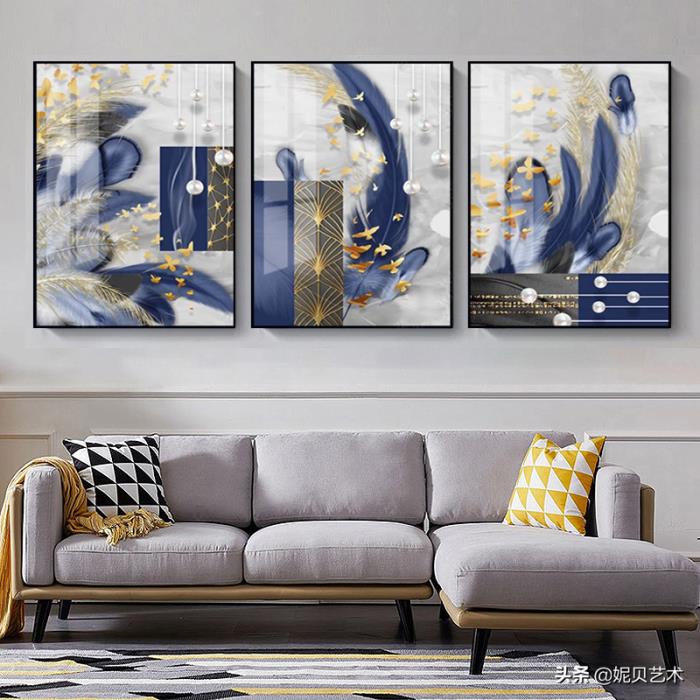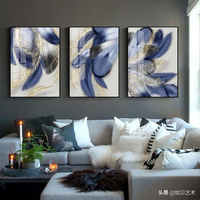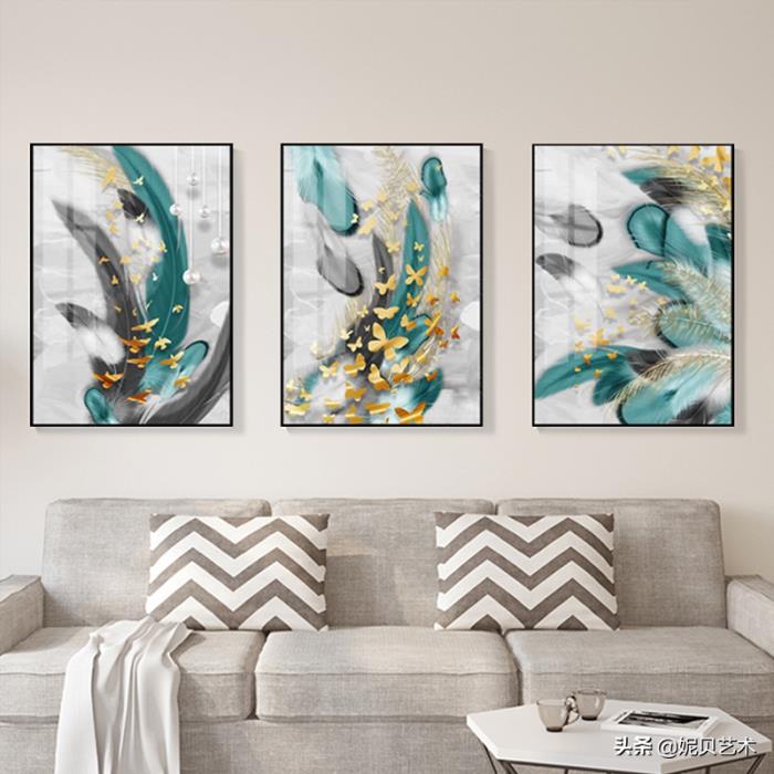 羽毛装饰画和现代简约金叶子植物装饰画,软装的最后一步是画龙点睛,挂画摆件也是最后一步要去设计的,在装修后的软装搭配顺序,从重原则 沙发,地毯,窗帘,柜子等大型家具进场后,接下来就是装饰画了,分享几款适合现代,简欧,后现代装修风格的装饰画。