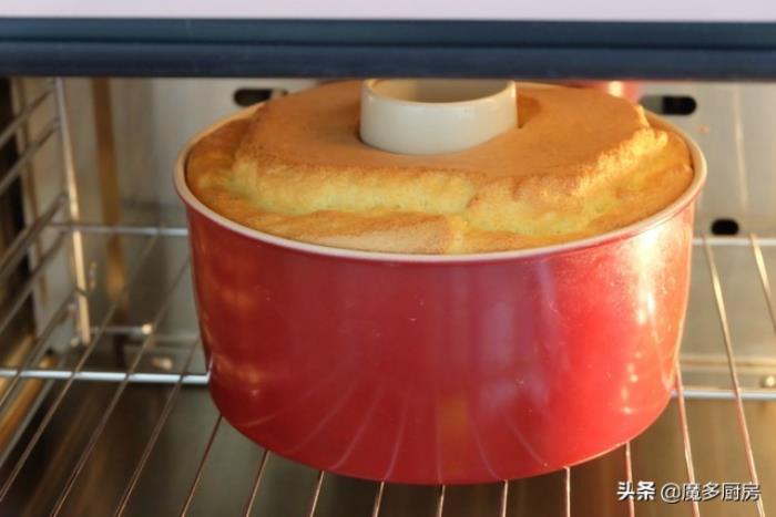 烤好的戚风蛋糕需要迅速倒扣在晾网上,让蛋糕体内的热气及时散出,这样蛋糕成品才会蓬松柔软口感好;另外脱模一定要等到蛋糕完全凉了以后再进行;
