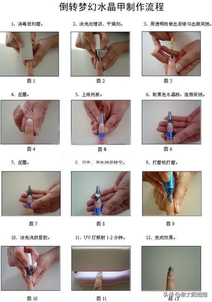 水晶钳:仅在做水晶指甲时使用。(可有可无吧,姐姐一般都用指甲钳代替,小心点剪就好了。)指甲刀:主要用于修剪所有类型的指甲,包括水晶指甲和天然指甲。钢推:死皮软化剂和钢推,如果是手比较敏感的妹子不建议修死皮,新手操作不好也很容易见血……刷子:用于手部护理时清洁指甲及水晶指甲。(用多余的散粉刷完全可以)小剪刀:剪一些丝啊线啊什么的装饰品。小镊子:用于夹持指甲片、钻石,或夹住指甲皮以便修剪 。光疗机:我建议选择36W的,功率太小了有些胶照不干,功率太高的(甲油胶在固化的时候是会释放热量的)如果一下子干得太快会觉得烫手。美甲UV灯照多了手会变黑,最好带个手套!搓条:一般分为粗砂条、修型条、海绵挫这三种,海绵挫有两面,一面比较粗糙一面比较光滑,粗糙面可以用于刻磨甲面,光滑面用来抛光。美甲笔:高频率用到的有波点笔、彩绘笔,渐变笔,渐变笔和戳戳笔对新手做渐变真的很友好!拉线笔和其他的笔手残党就根据自己需求购买吧。配饰:金箔纸、贝壳片、珍珠、小钢珠、星月钻、玻璃纸……根据自己的需求去购买。美甲的相关配饰实在是太多了,卸甲产品:卸甲包、挫条、刚推。有条件可以买电动卸甲机,我就买了一个,觉得还挺好上手的,但是新手千万小心不要伤到自己。如果觉得自己一件件地去购买麻烦,可以直接选择购买美甲套装。套餐的东西基本都比较齐全。也就省去初学者乱买一通的麻烦。(这里姐姐是让大家不要乱花钱,哈哈)
