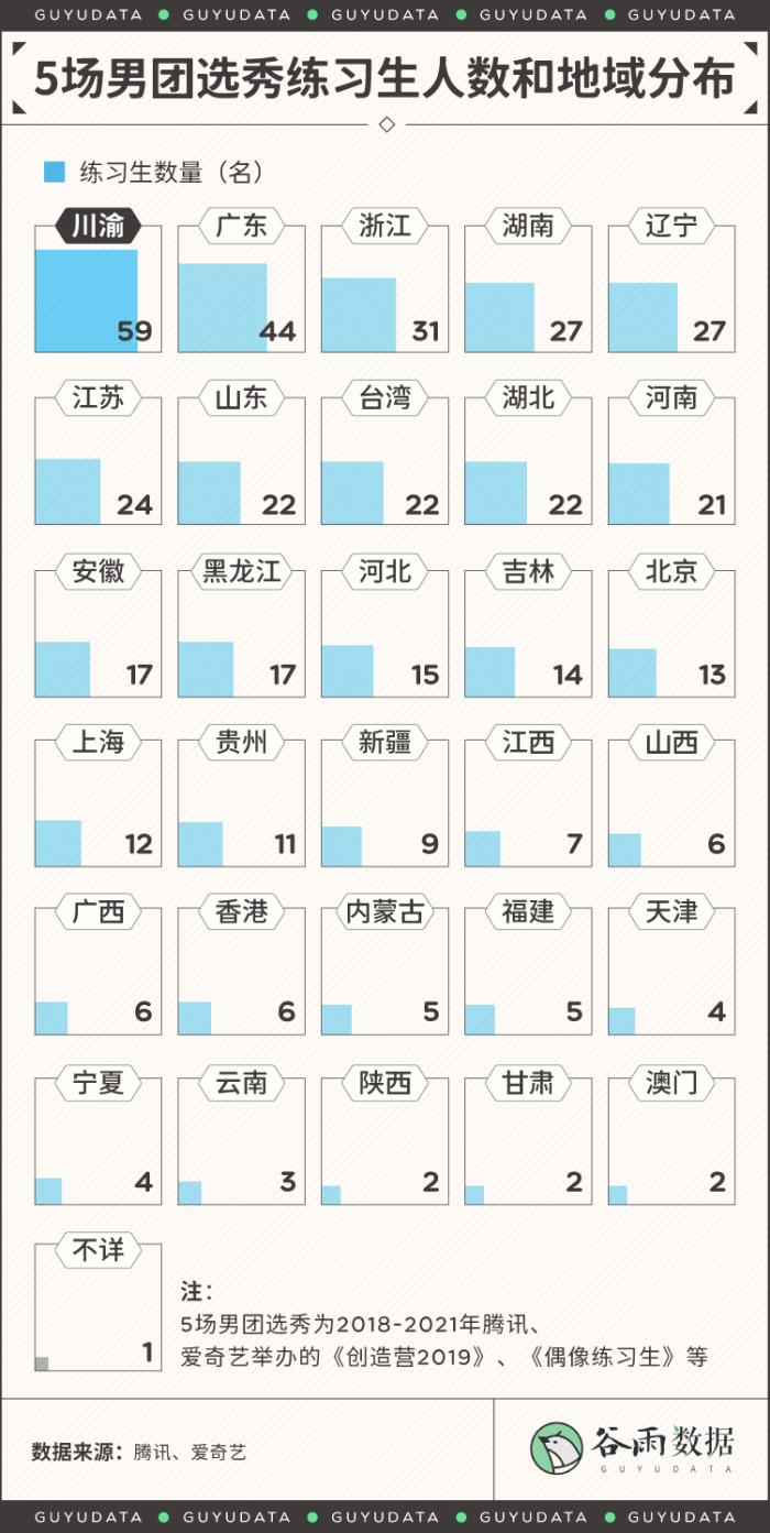 5档节目中,中国籍练习生一共有460人,其中最多的就是川渝小伙:59人,其中四川选手32名、重庆选手27名。