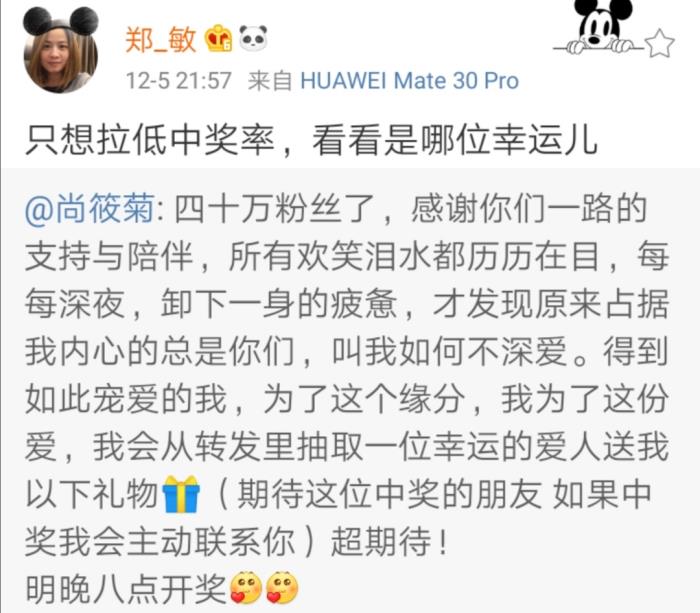 岳云鹏的媳妇转发了这个微博,只想拉低中奖率,看看是哪位幸运儿。大伙都在提醒没有认真看题的菊宝师娘,上当了,不是尚筱菊送粉丝礼物,是粉丝买礼物送尚筱菊。
