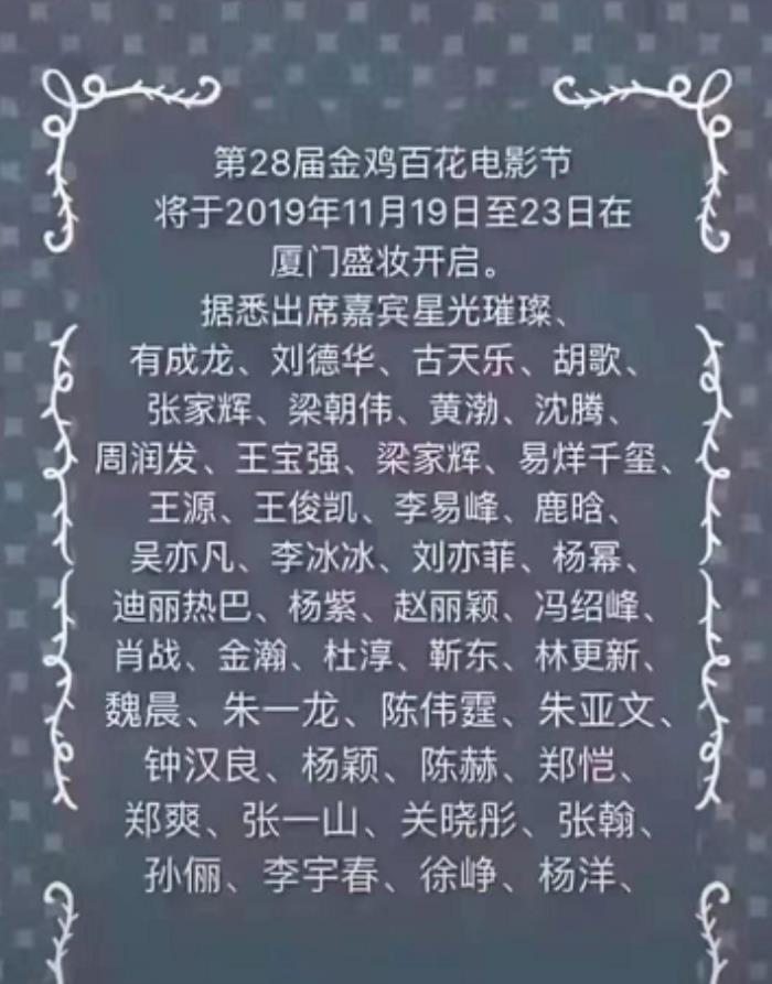 11月19日,第28届金鸡奖将会在美丽的厦门正式拉开帷幕,和往年一样,在本届金鸡奖的颁奖典礼正式开始之前,受邀出席的嘉宾阵容名单,就已经出现在了网络平台上面,那么,都有哪些知名演员会出席今年金鸡奖呢?