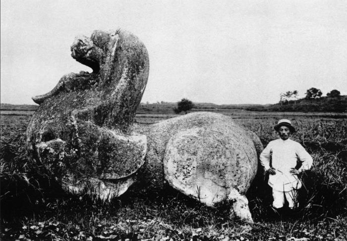 第5名:梁墓。从南京尧化门车站至栖霞寺车站之间,沪宁铁道沿线有梁萧侍中墓、始兴忠武王墓、以及张家库的梁墓。(图:1918年,日本考察学者与墓前石狮的合影,白衣映衬着荒野古墓,阴森之气扑来。)