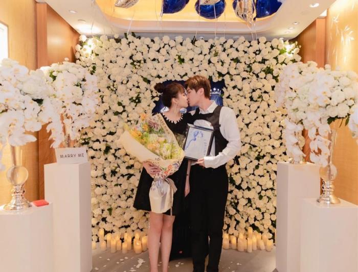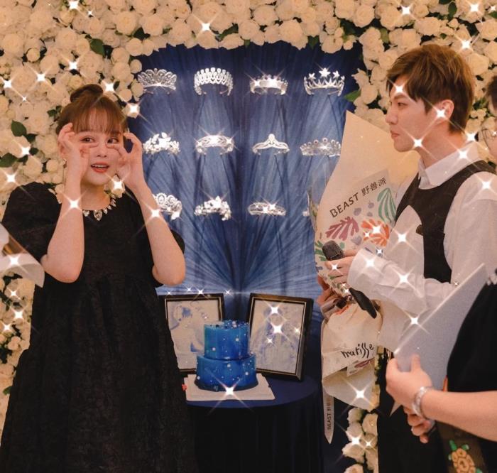 现场用浅色的玫瑰布置了花墙,中间则是蓝布打底挂着精致的王冠,场景很是浪漫。球球的男友穿着白衬衫搭配黑色西装裤,留着浅栗色的精致短发,打扮较为正式,只见他掏出钻戒单膝下跪,侧颜十分优越,颜值不输男明星。